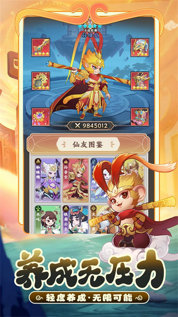 4、多维羁绊合击:除了传统的阵营克制,游戏深度还原了原著中的宿命关系。上阵特定组合(如“大圣+哪吒”或“唐僧+悟空”)可触发专属“合击技”,带来全屏高额伤害与华丽动画演出。